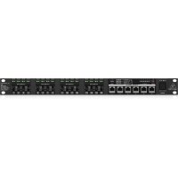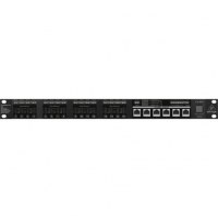 Den har 6 RJ‑45 porte og 16 udgange i 1/4"-format (booth out).