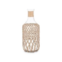 - Den er lavet af gennemsigtigt glas med naturreb omkring hals og krop.