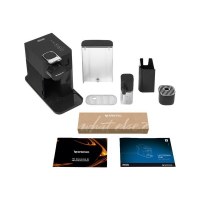 Maskinen har berøringsstyring, opvarmes på ca. 25 sekunder og slukker automatisk for energibesparende brug. Den aftagelige vandtank på 0,9 l og drypbakken gør rengøring og påfyldning enkel, og et renseprogram hjælper med at holde maskinen i topform. Designet er fritstående i sort plastik, der passer elegant ind i de fleste køkkener.