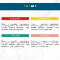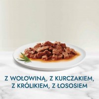 - Variation af smage: kylling, okse, kanin og laks