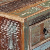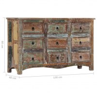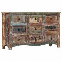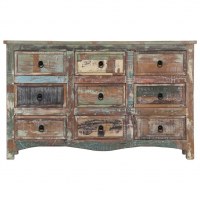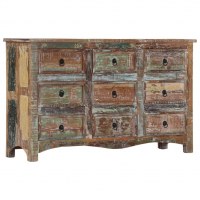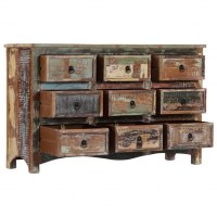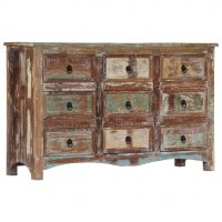 Dette skuffeskab i retrostil er lavet af massivt, genanvendt træ, som stammer fra tværbjælker, gulve og støttebjælker fra gamle, nedrevne bygninger, og de kan bestå af forskellige trætyper såsom fyrretræ, teak, bøg, eg, ceder, mangotræ, akacie osv. Dette betyder, at genbrugstræ bevarer karakteristikkerne af disse forskellige trætyper. Genbrugstræ er allerede ældet, forvitret og tørret, så det skrumper eller bukker ikke. Dette smukt designede sideskab er yderst stabilt, holdbart og iøjnefaldende. Det udsøgte håndværk og de smukke træårer gør hvert møbel unikt og en smule anderledes. Denne skænk har desuden 9 skuffer, hvilket giver rigelig med plads til opbevaring af dit tøj, dine bøger samt andre ting og sager.