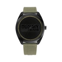 - Markant sort skive med TOMMY JEANS-logo og grøn rem